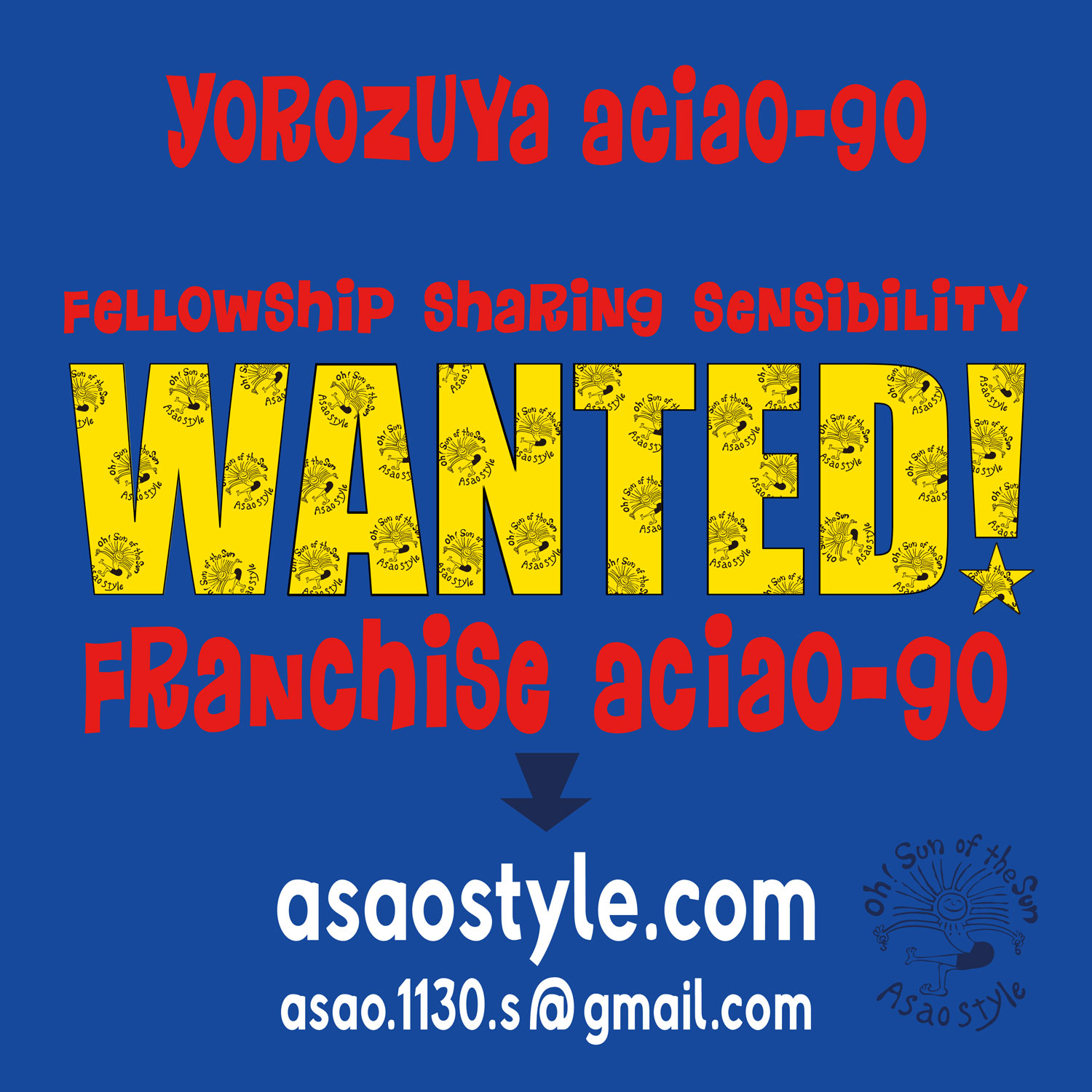 | 募集 Wanted! YOROZUYA Aciao-Goのフランチャイズに興味をお持ちの方、ご質問等お気軽にお問い合わせください。 メールまたは、FACEBOOKからメッセージにてお問い合わせお願いします。 |